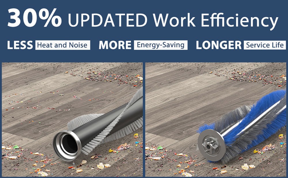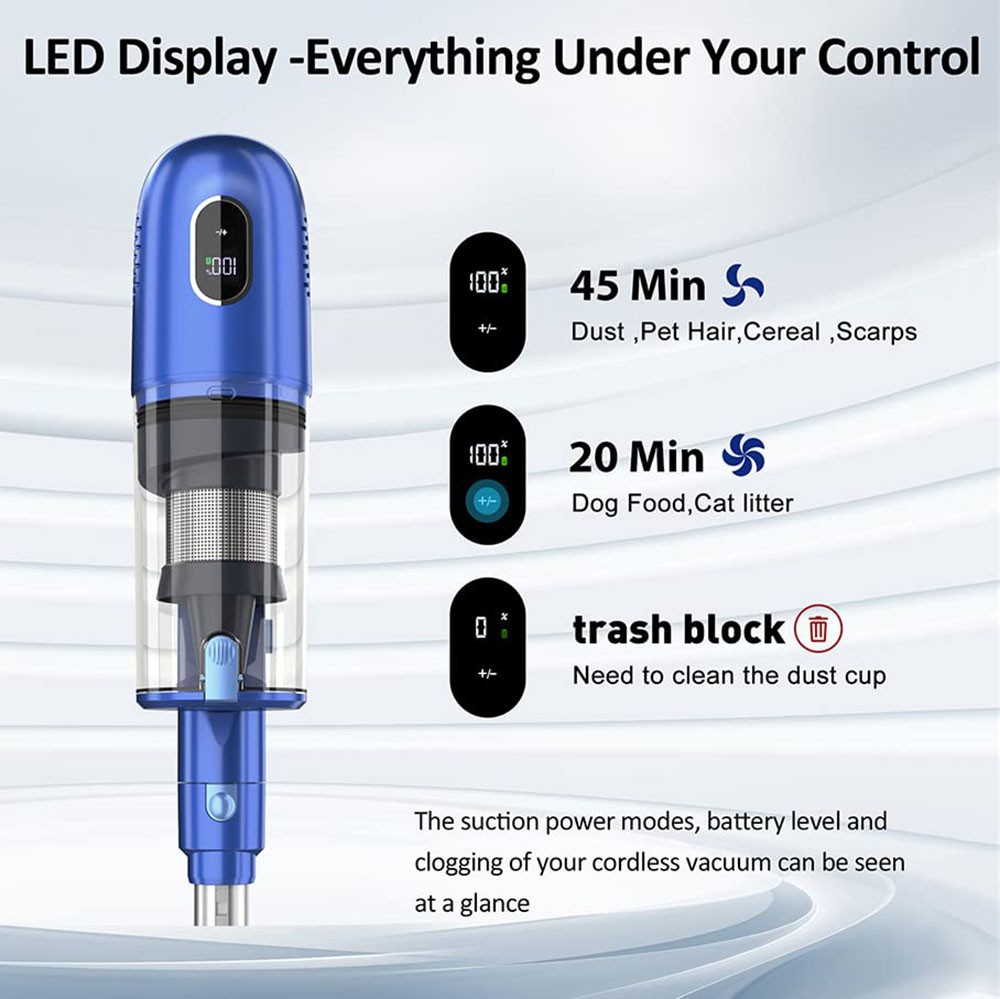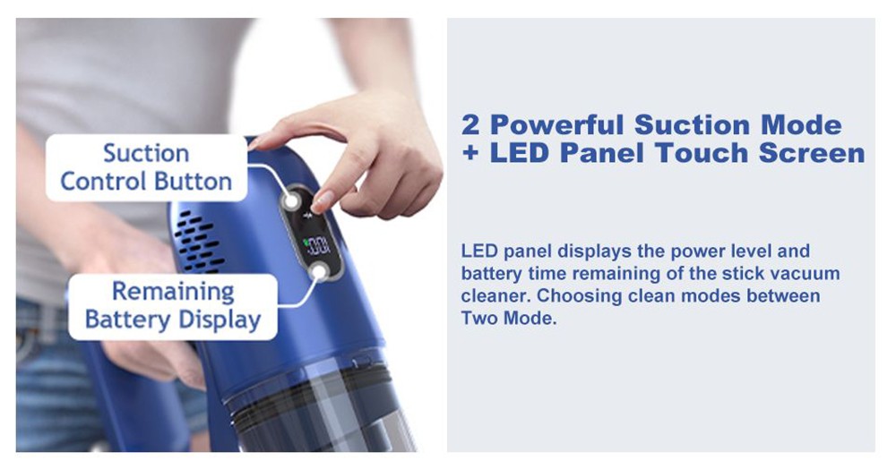 There is an LED touchscreen on the top of the machine that displays the real-time remaining battery life. Switchable between 2 power modes by touching the screen instead of pressing buttons. It can easily clean different surfaces in a short time, including hardwood floors, pile carpets, tiles, marble, etc.