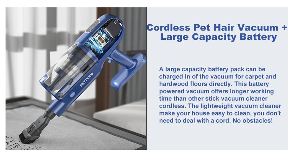 PRETTYCARE P1 cordless vacuum cleaner has 2 different suction powers, which can be adjusted from 11000Pa to 26000Pa as needed. Equipped with a powerful 180W engine, it can easily suck dust, hair, coffee beans, animal fur, cat litter, and dog food such as dirt particles. It also generates less heat and less noise (65db) to offer a quiet cleaning environment.