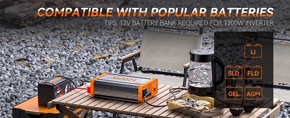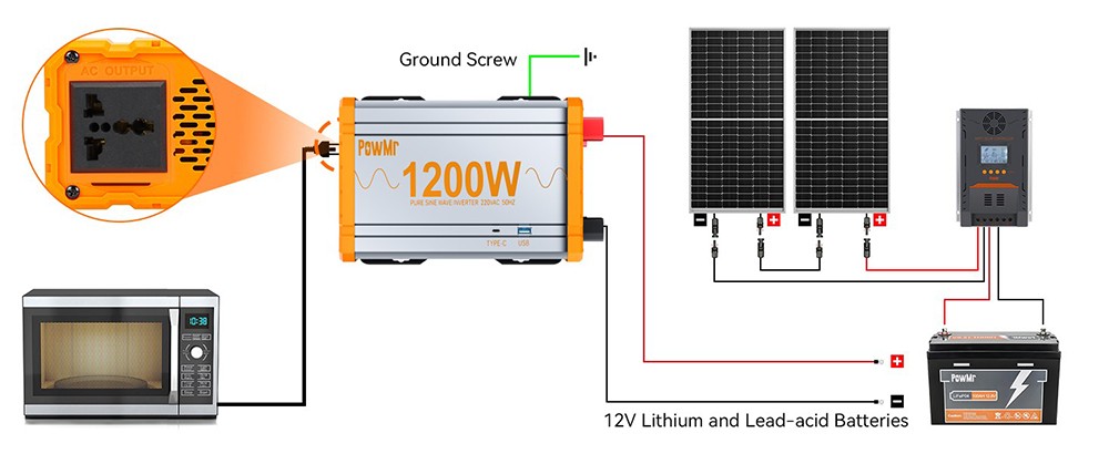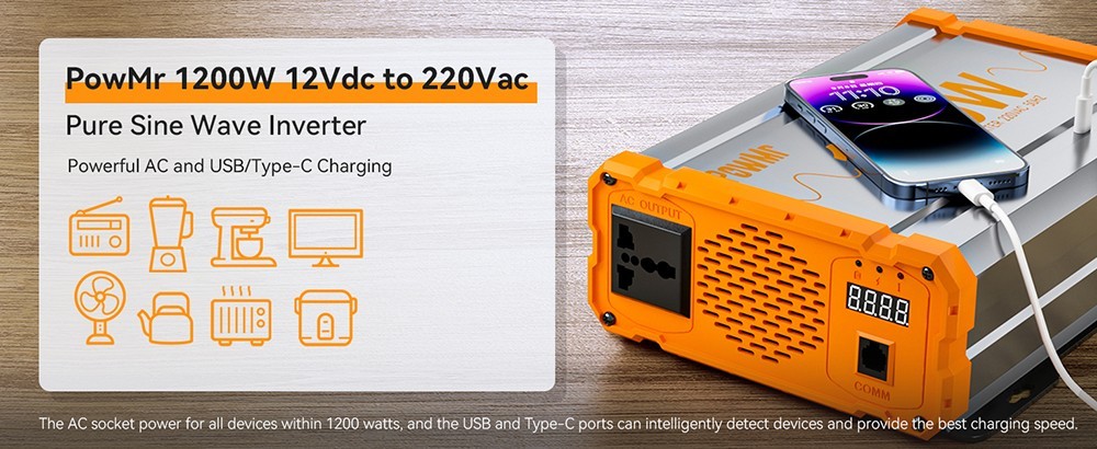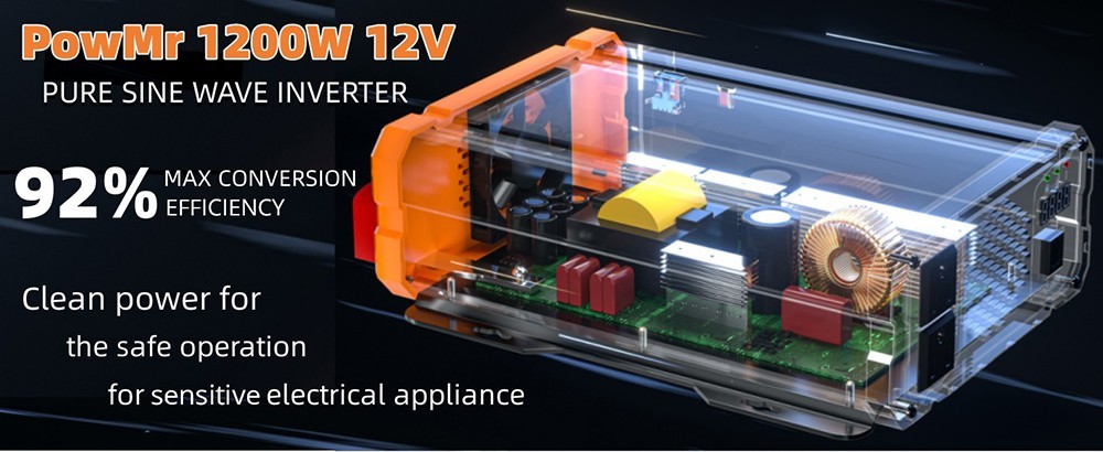 PowMr 1200W 12V pure sine wave solar inverter has a maximum efficiency of 92%, it can offer clean power for the safe operation of sensitive electronics.