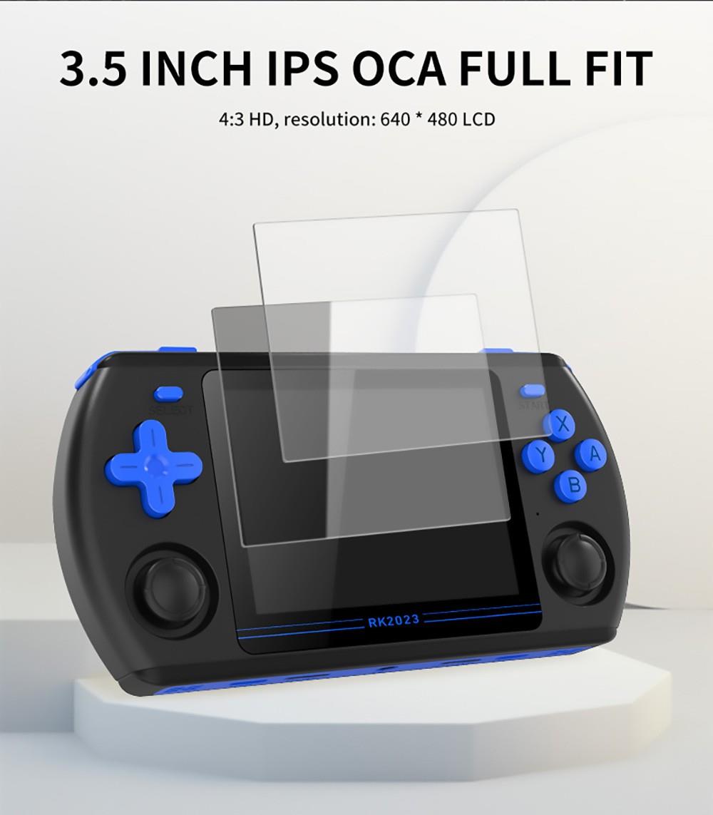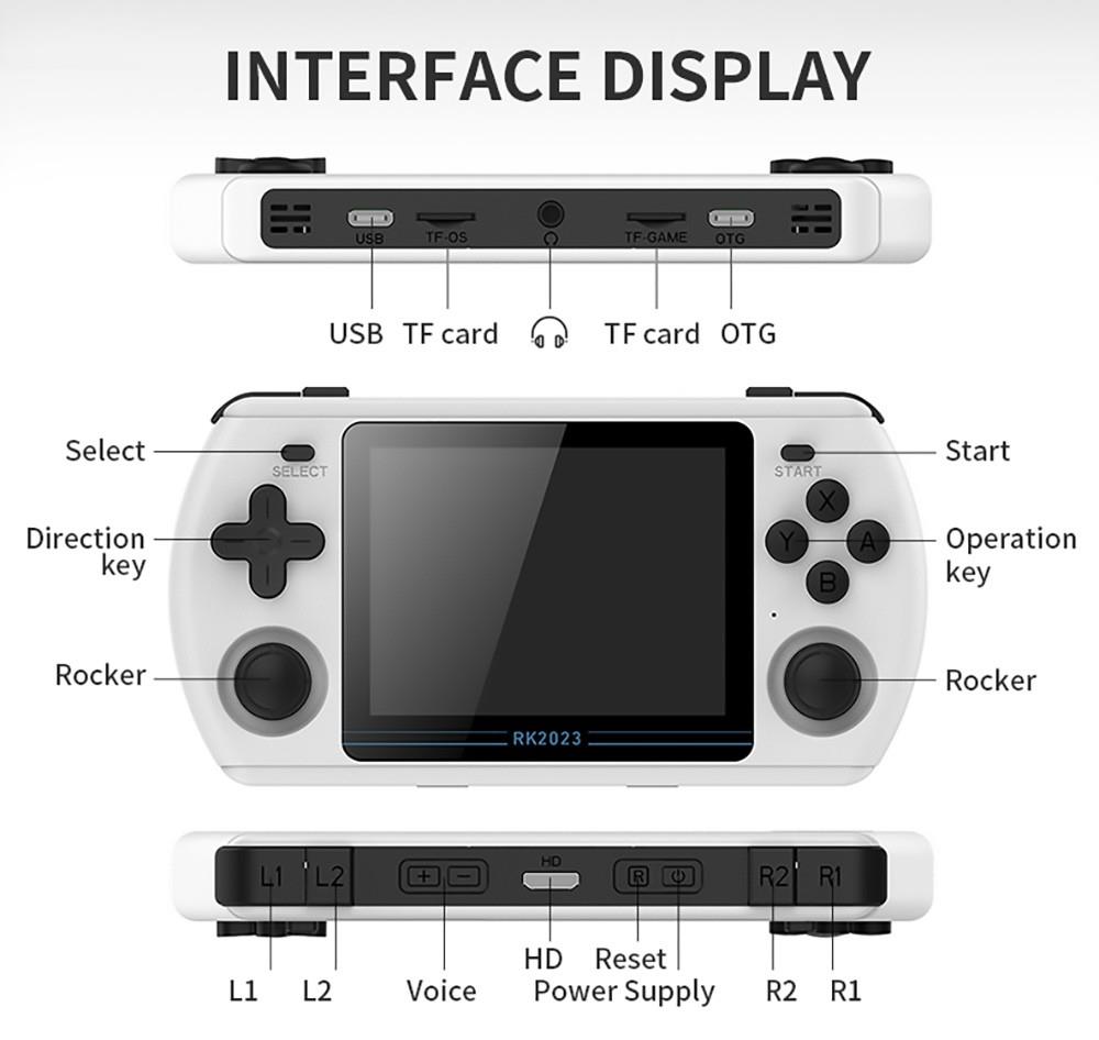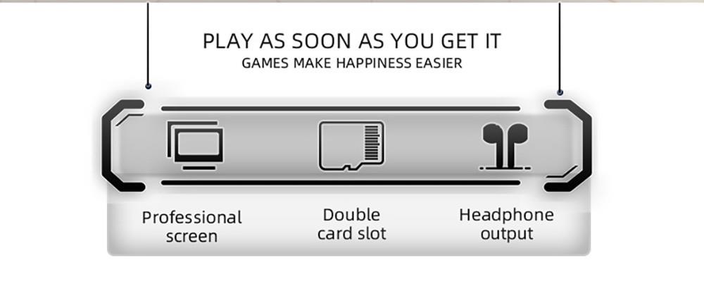| Specification | System: Open Source Linux Game: Compatible with MAME/N64/PS/CP3/NEOGEO/GBA/NES/SFC/MD/NDS and Other Simulators Display Screen: size 3.5 "IPS OCA Full Fit Resolution: 640 * 480 Main CPU: ARM four-core 1.8GHz High-performance RK3566 Open-source Chip RAM: LPDDR4 1GB External Storage: 16GB+256GB Sound: Built-in Cavity Speaker 1W * 2 Stereo Effect Power Supply: Built-in lithium battery 3500mAh Input Power: 5V2A Maximum Power Consumption: 5W Battery Life: 8 Hours Charging Time: 2 Hours Interface: TYPE-C Fast Charging TV HD Display: Supported OTG-USB: Support Headphone: Standard 3.5mm |