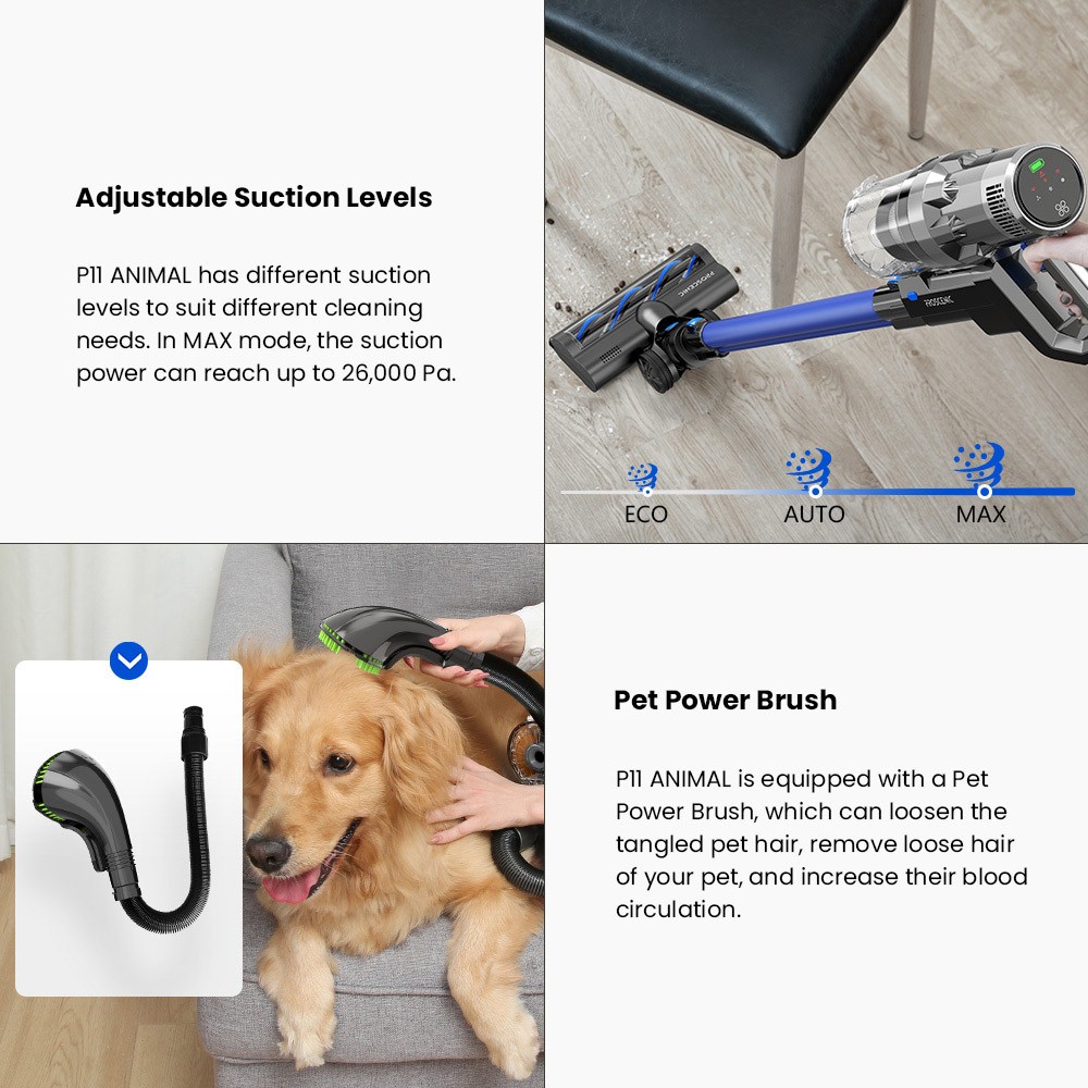 P11 ANIMAL has different suction levels to suit different cleaning needs. In MAX mode, the suction power can reach up to 26,000 Pa.