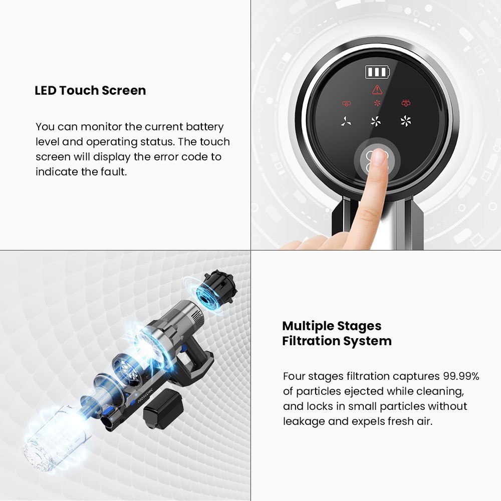 With a 4-level filter system, the cordless vacuum cleaner captures 99.98% of fine dust and dust mites, collects small particles without leakage, and provides fresher air for your family.