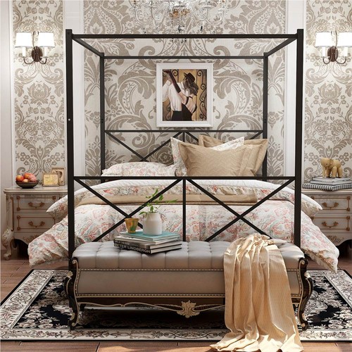 Platform metal bed with no need for box spring provides valuable under-bed storage. Stylish appearance with vintage headboard and footboard.