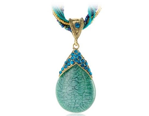 A raindrop shaped rhinestone pendant with blue crystal decoration