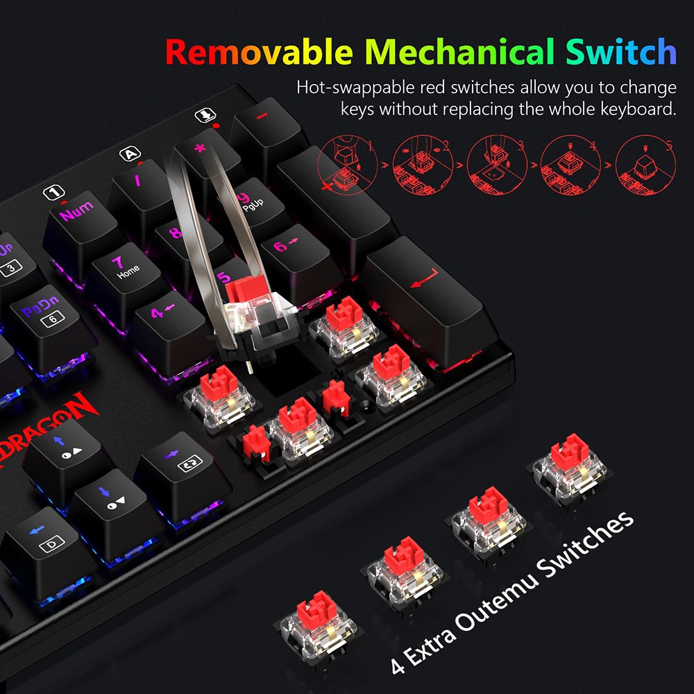 The removable red switches respond faster and require less force to press, allowing you to type easily and change switches without replacing the whole keyboard. The keyboard comes with 4 extra Outemu switches for replacement.