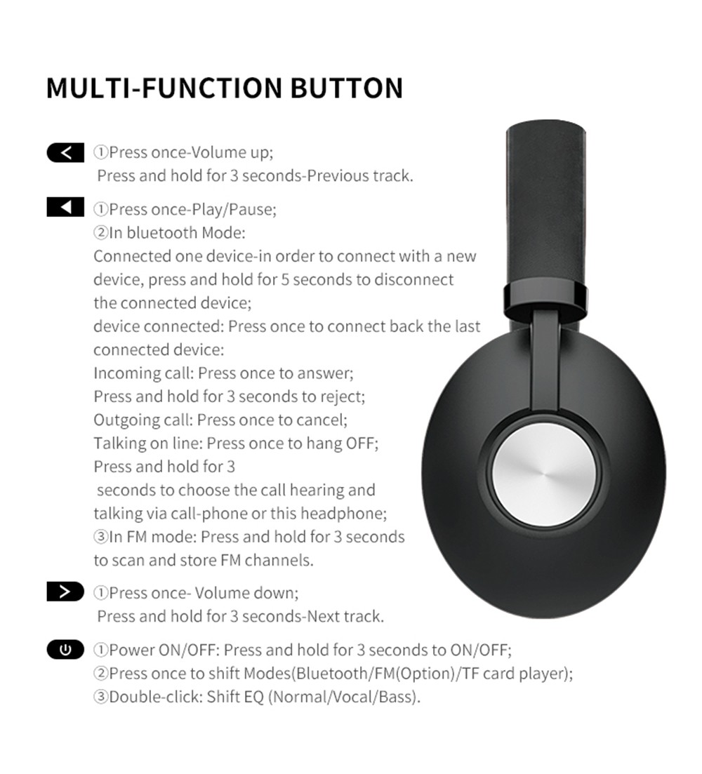 | Specification | Check Button: Yes Wireless Type: Bluetooth Communication:Wireless Vocalism Principle: Dynamic Volume: Yes Frequency response:100-10000hz Sensitivity:110±4db Codecs:Apt-X HD Memory Card Support: YES with microphone: Yes Resistance: 32Ω Bluetooth Range: more than 10 meters Playtime: 6-8 hours Charging Time: less than 3 hours |