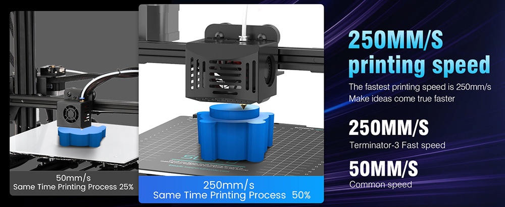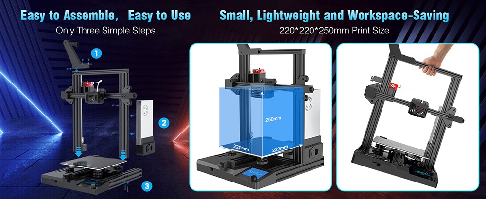 Full body metal frame with a stable square base is more accurate and stable. 220*220*250mm print size.