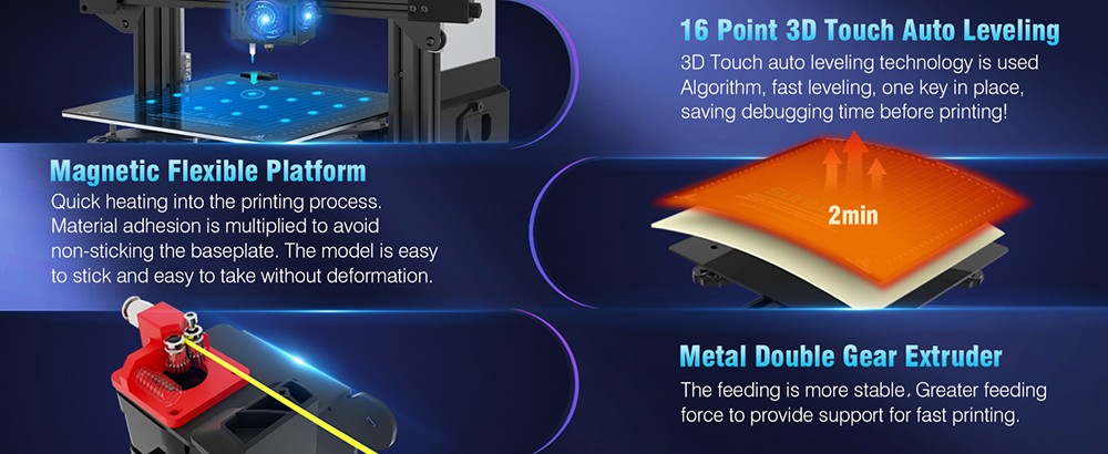 The magnetic platform with excellent thermal makes it conductivity up faster. Quick heating into the printing process. Material adhesion is multiplied to avoid non-sticking the baseplate. The model is easy to stick and easy to take without deformation.