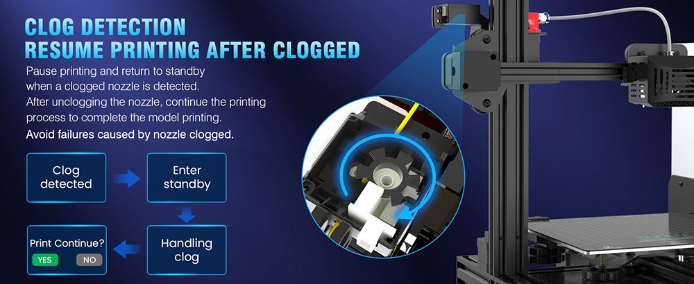 Pauses printing and returns to standby when a clogged nozzle is detected. After unclogging the nozzle, continue the printing process to complete the model printing. Avoid failures caused by nozzle clogging.