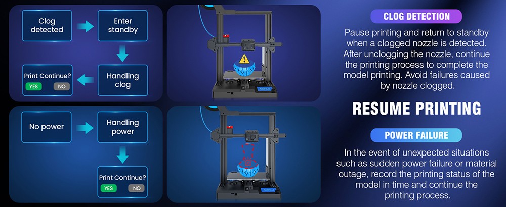 Built-in-power failure detection module and memory module, real-time tracking of printing process. In the event of unexpected situations such as sudden power failure or material outage, record the printing status of model in time and continue the printing process.