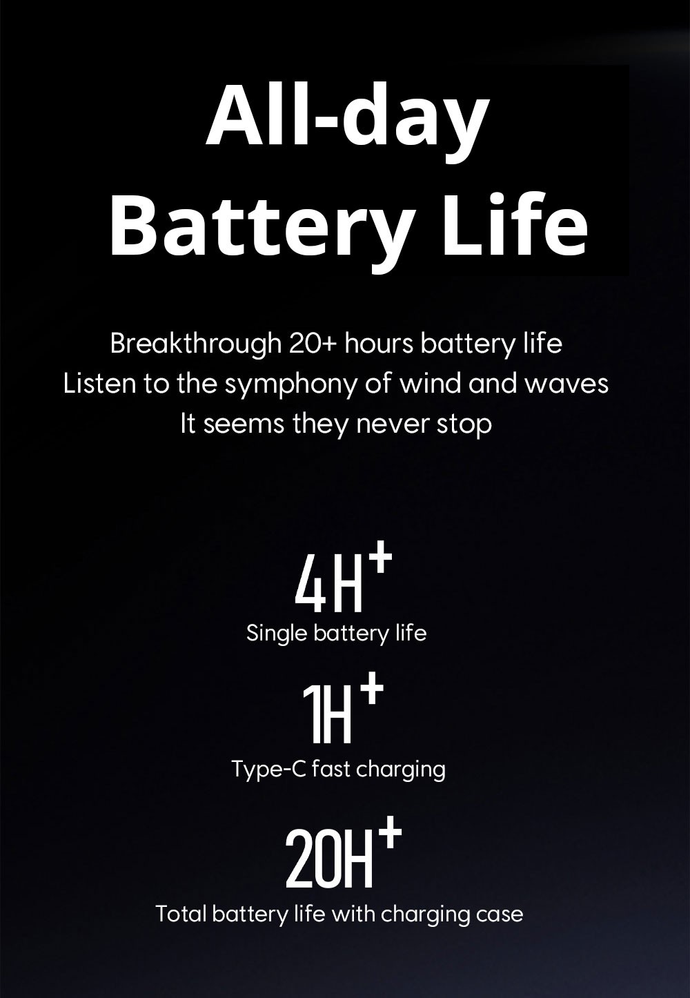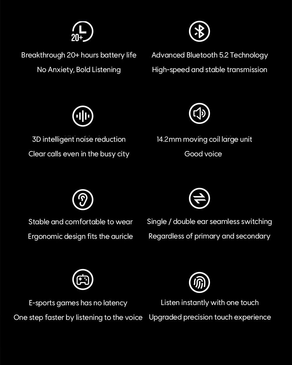 | Specification | Bluetooth: BT5.2 Speaker Unit: 14.2mm bio-fiber speaker unit Headphone Shape: Ergonomic semi-in-ear design Frequency Range: 20-20000Hz Audio Decoding: AAC/SBC Support Protocol: HSP/HFP/A2DP/AVRCP Impedance: 16Q Sensitivity: 101±3db@1k, 1mw Call Noise Reduction: Intelligent Noise Reduction, High-Definition Calls |