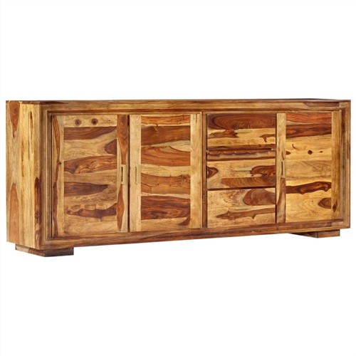 If you're looking for a simple touch of the retro style, this elegant solid wooden sideboard will do the trick. The sideboard has a solid top for placing drinks, fruit baskets, photo frames, or potted plants. The three drawers and three large compartments provide ample space for storing books and other items. This side cabinet is made of solid Sheesham wood. Sheesham, also known as rosewood or palisander, is a tropical hardwood that is famous for its rich grains. Additionally, its beautiful wood grains make every piece of furniture unique and slightly different from each other. Important note: Colours vary from piece to piece, making each of our sideboards unique; the delivery is random.