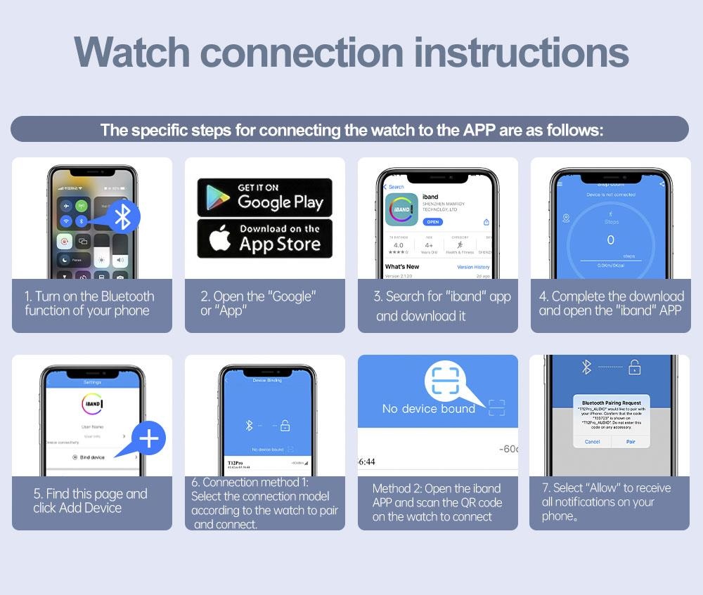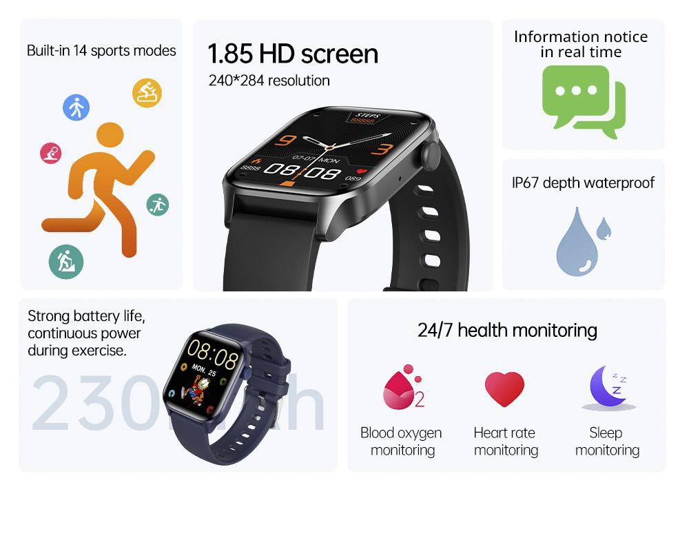 | Specification | Screen: 1.83 inch Resolution: 240*284px System: Android 5.0 and above, IOS 12.1 and above Bluetooth: Bluetooth 5.2 Waterproof: IP67 Material: Plastic Memory: 32M APP: I Band |