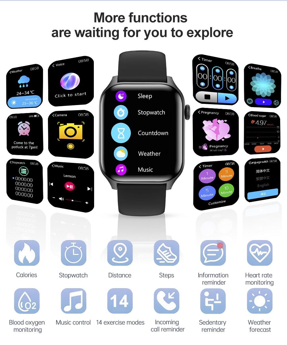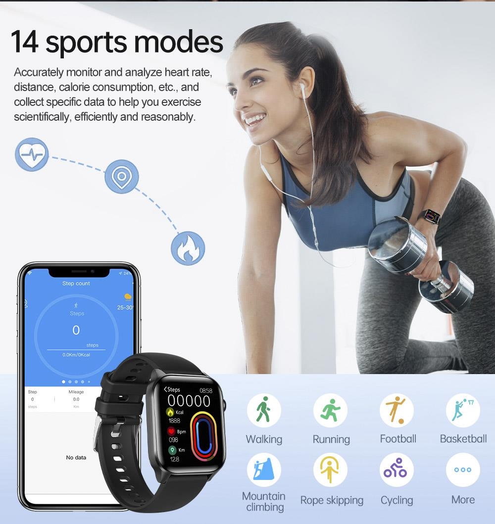 | Functions | Phone function, heart rate measurement, blood oxygen measurement, blood pressure measurement, blood sugar measurement, weather information, sleep information Exercise records: step counting, exercise time, exercise mileage, calorie consumption, sleep monitoring, uploading to APP to save exercise sleep data Full touch/health monitoring/APP download Turn your wrist to turn on the screen, time display, remote photography, music control, stopwatch Intelligent reminders: phone calls, messages, QQ, WeChat, and more news push Do not disturb mode settings, find the bracelet Sports modes (walking, running, cycling, mountain climbing, skipping, basketball, football, badminton, ice hockey, rowing machine, gymnastics, baseball, boxing, push-ups, 14 sports modes) News notification: phone, message, QQ, WeChat, Facebook, Twitter, WhatsApp, Linkedin, Instagram, Messenger, Snapchat, Line, Kakao Talk, Viber, skype, telegram |