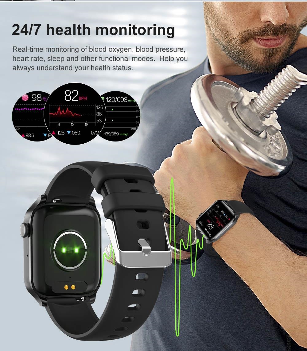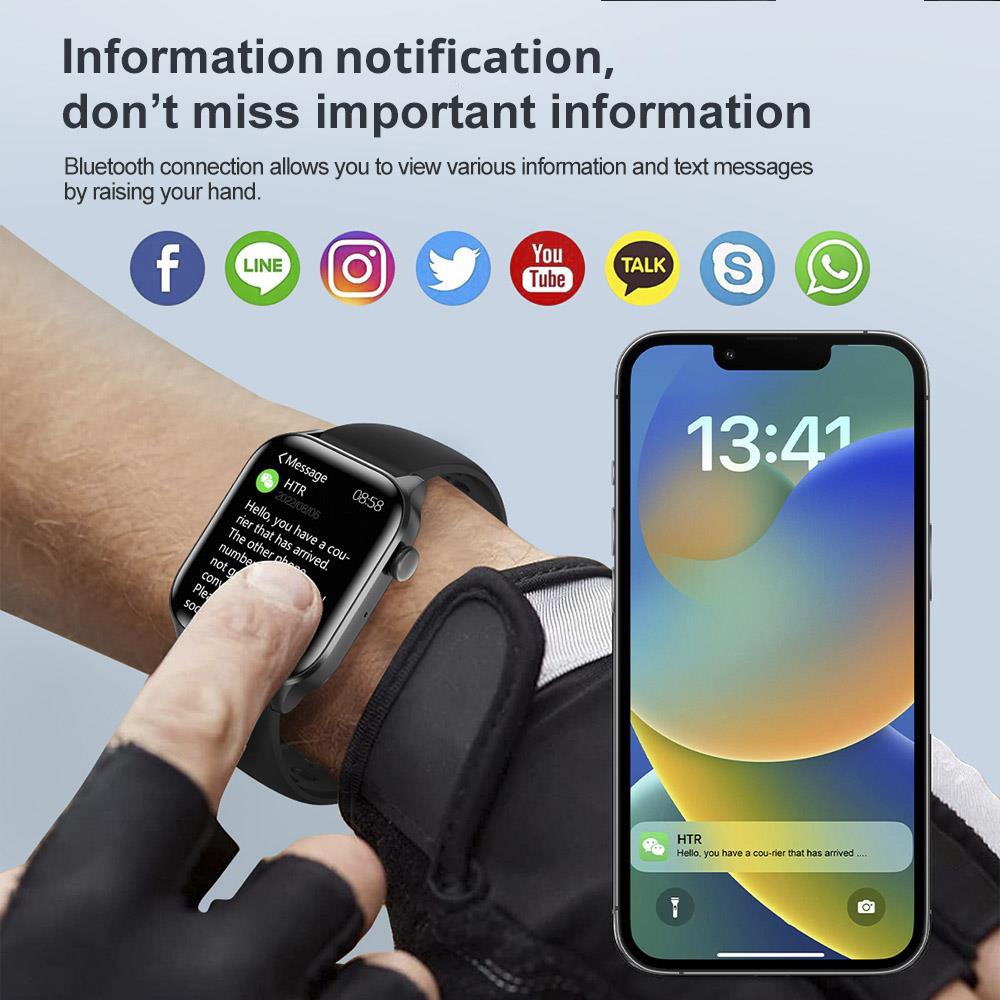 | Functions | Phone function, heart rate measurement, blood oxygen measurement, blood pressure measurement, blood sugar measurement, weather information, sleep information Exercise records: step counting, exercise time, exercise mileage, calorie consumption, sleep monitoring, uploading to APP to save exercise sleep data Full touch/health monitoring/APP download Turn your wrist to turn on the screen, time display, remote photography, music control, stopwatch Intelligent reminders: phone calls, messages, QQ, WeChat, and more news push Do not disturb mode settings, find the bracelet Sports modes (walking, running, cycling, mountain climbing, skipping, basketball, football, badminton, ice hockey, rowing machine, gymnastics, baseball, boxing, push-ups, 14 sports modes) News notification: phone, message, QQ, WeChat, Facebook, Twitter, WhatsApp, Linkedin, Instagram, Messenger, Snapchat, Line, Kakao Talk, Viber, skype, telegram |