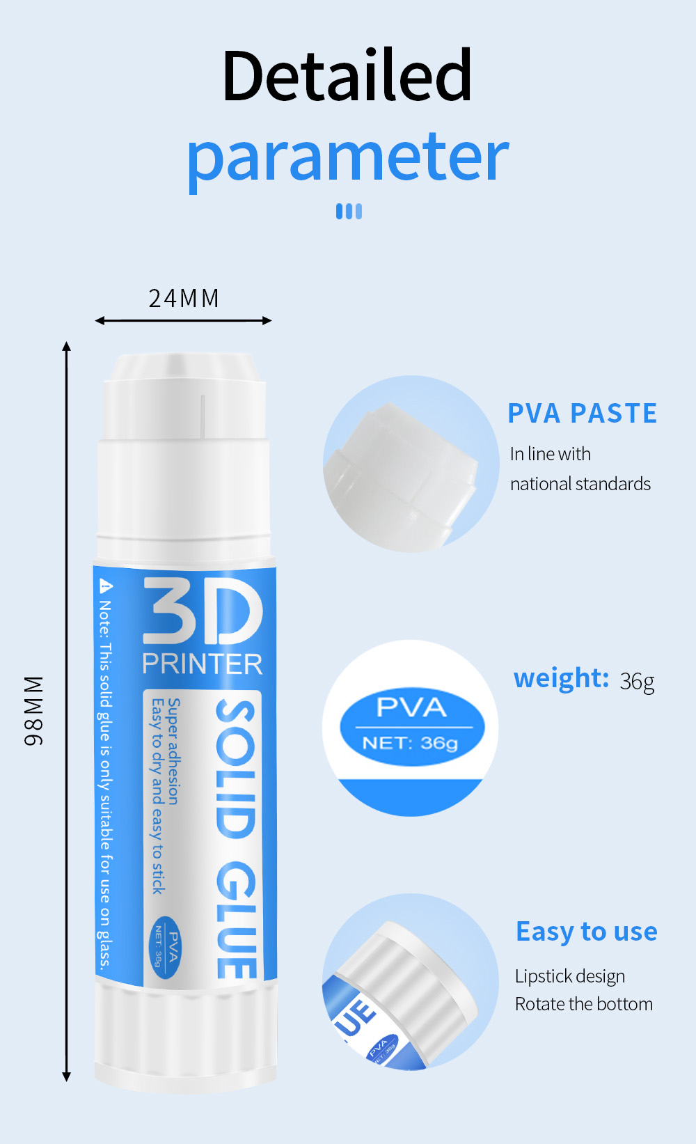 1. This solid glue is special for hotbeds of 3D printers, it can be reused many times without bonding. The solid form has good viscosity, and high density, and is not easy to penetrate.