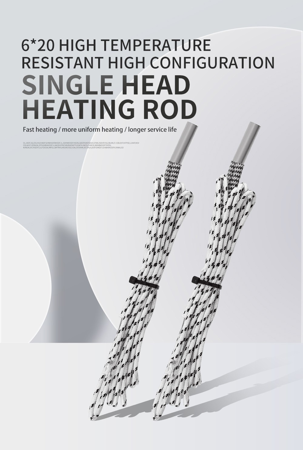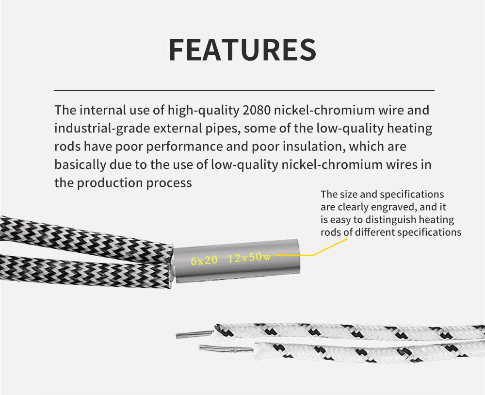 | Specification | Size: 6*20mm Voltage: 12V Power: 50W Cable length: 1M Heating Head Material: stainless steel (304) |
