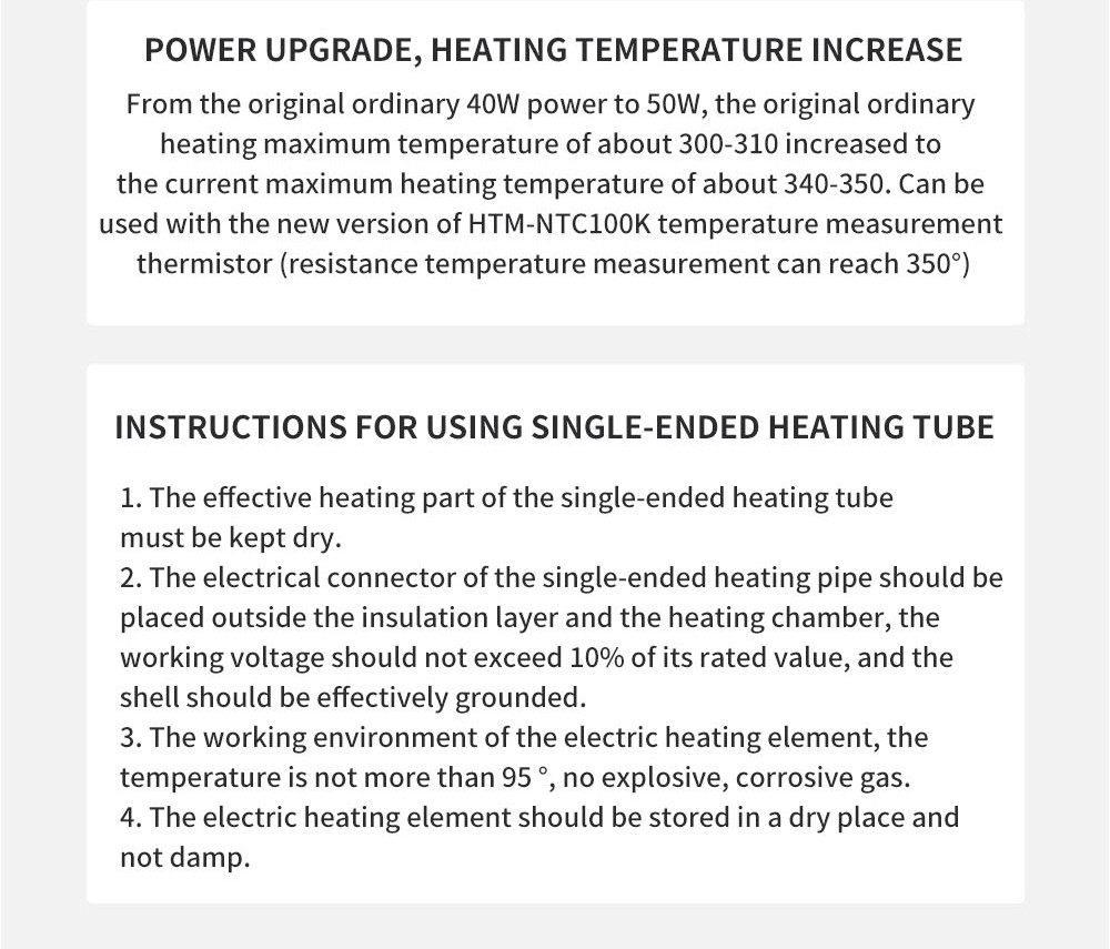 4. It has 50W power and a maximum heating temperature of about 340-350 Celsius. Also, it can be used with the new version of HTM-NTC100K temperature measurement thermistor (resistance temperature measurement can reach 350 Celsius).