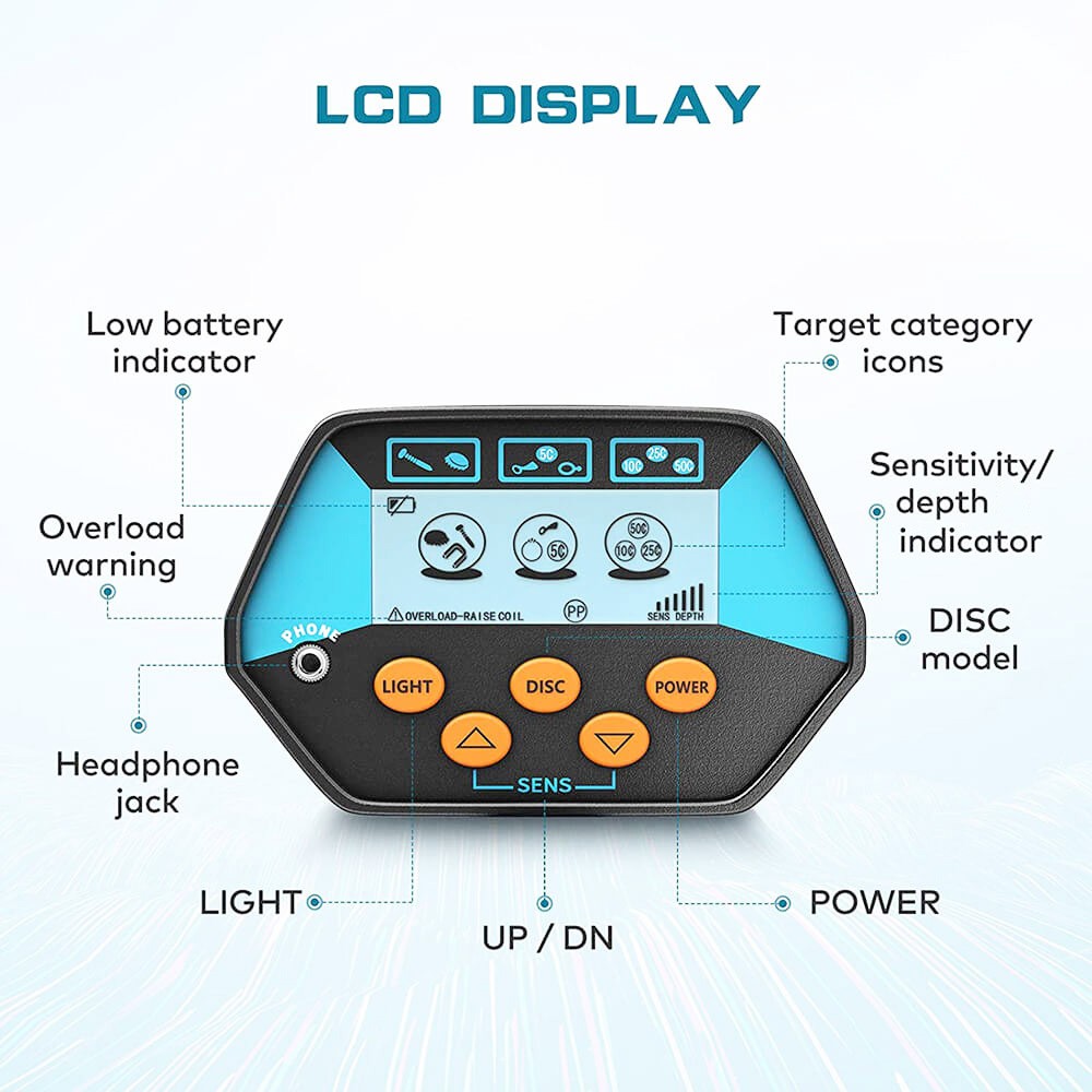 Auto-tone and disc mode metal detector has distinctive audio tone – a low tone, a medium tone, and a high tone displayed on the icon that can distinguish different metals; DISC modes help you eliminate target categories and improve your detecting efficiency.
