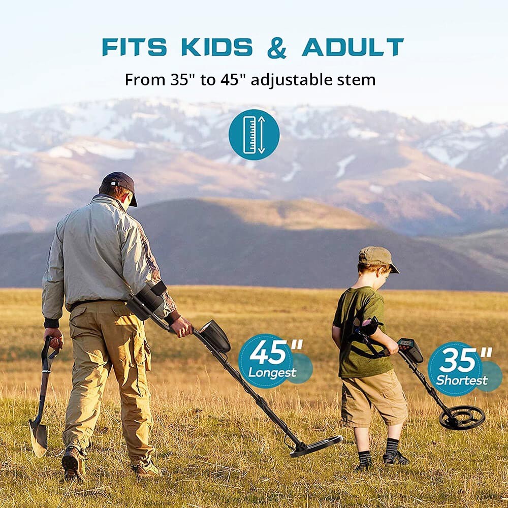 Tilswall metal detector with ergonomic design handle, providing a comfortable feel for long-term use. Adjustable stem extending from 35” to 45” suit for all age metal detector enthusiasts, and it weighs only 2.35 pounds.
