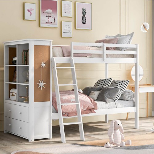 The bunk bed is constructed with solid pine wood for the frame and high-quality plywood for secured support slats, durable and sturdy for the long last. Feature a special cork board, papers can be nailed on the light brown part.