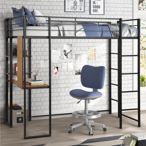 The loft bed includes a desk and two shelves integrated into the metal frame and has 58.3” under-bed clearance.