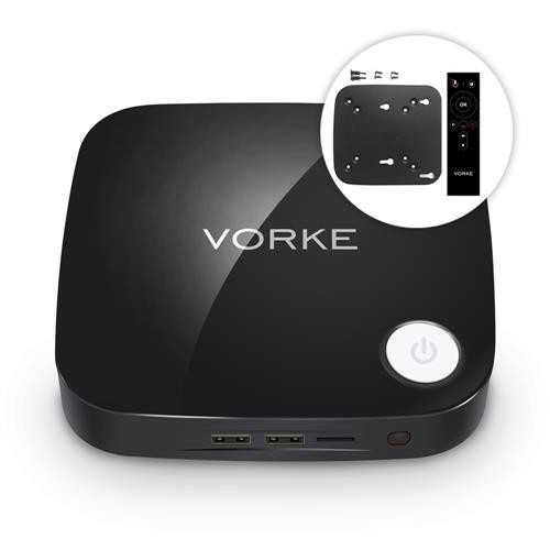 | Package Contents | 1 x MINI PC 1 x Power adapter (A right AC Adapter will be sent as your shipping country) 1 x Display mount 1 x Vorke R1 IR remote control 1 x Charging cable 1 x User manual |