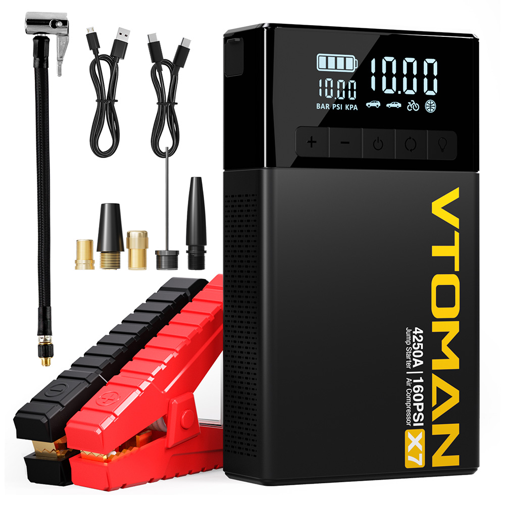 The X7 car jump starter delivers an impressive 4250A peak current and a high-capacity battery, easily starting all 12V vehicles up to 10L gasoline or 10L diesel engines—including pickups, trucks, SUVs, boats, and regular cars. A single full charge supports up to 70 jump starts. It also inflates bicycles, balls, pool floats, and air mattresses (not for stand-up paddleboards).