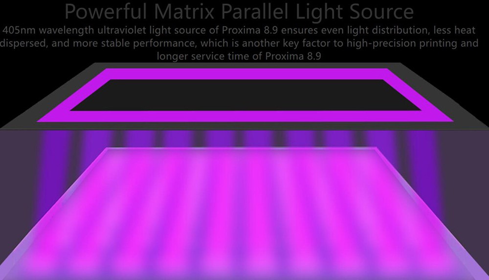 405nm rectangle light source of Proxima 8.9 makes the light source distributed more evenly and disperses less heat on the LCD screen. Together with the 3840-pixel monochrome LCD screen, Proxima 8.9 could print more precisely and service for a longer time.