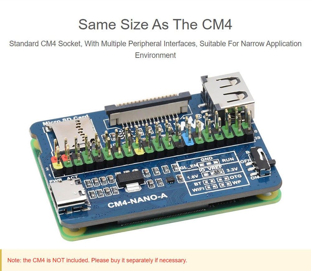| Specification | CM4 SOCKET: suitable for all variants of Compute Module 4 CONNECTOR: Raspberry Pi 40PIN GPIO interface USB: USB 2.0 Type A interface CAMERA: MIPI CSI-2 port × 1 (15pin 1.0mm FPC connector) STORAGE: Micro SD card socket for Compute Module 4 Lite (without eMMC) variants POWER INPUT: 5V |