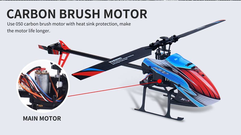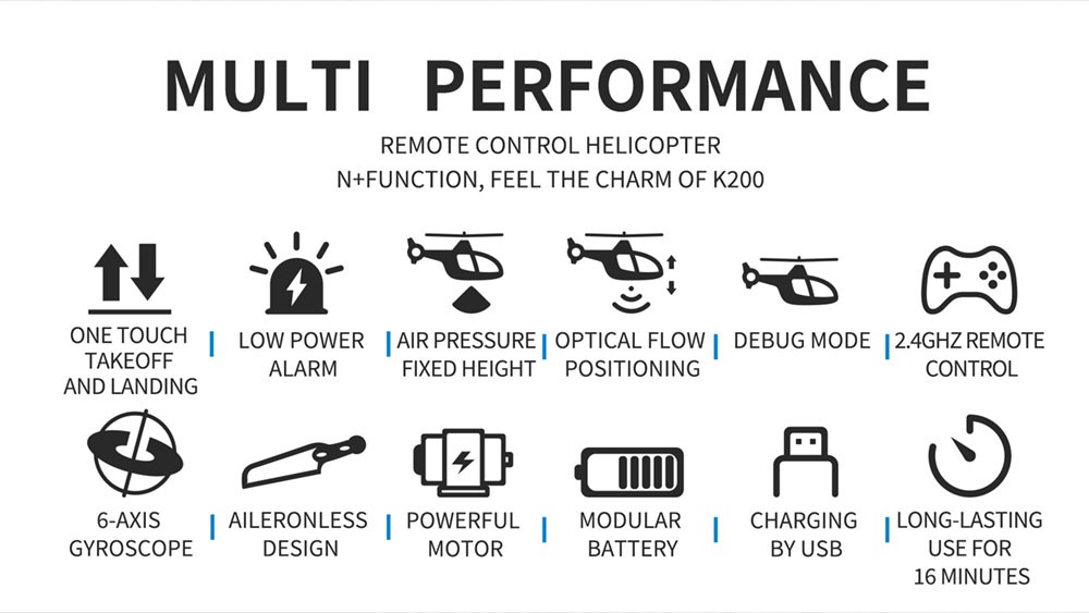 Materials: Nylon+Engineering Material Flight Time: 16min Charging Time: 90 min Remote Control Distance: 80-100 m Number of Drive Motors: 050 main motor *1 (carbon brush), 1020 tail motor*1(hollow cup) Battery : 7.4V 600mAh 25C Remote Control Mode: 2.4G remote control, 6 *AA batteries(Not Included) |