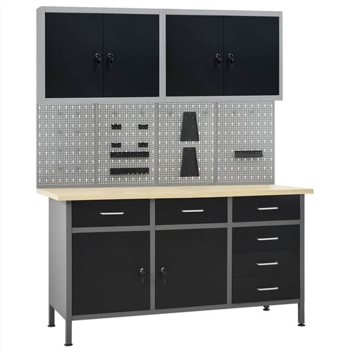 This set is combined with 1 workbench, 4 wall panels and 2 wall cabinets, which will make a practical storage solution to your workshop and garage. The heavy-duty workbench, standing out with ample storage space and 500 kg loading capacity. This large and sturdy tabletop provides a stable platform for all your repair works. The workbench has 6 drawers, to organize your tools, parts and accessories such as screws, nails and adhesive tape properly. All drawers are equipped with ball bearing mechanism for smooth sliding. There are 2 shelves and a large compartment with 2 lockable doors, which can easily accommodate drills, cable drums and grinders. Additionally, the feet are height-adjustable. This workstation is crafted from premium steel and chipboard, making it extra sturdy, durable and easy to clean. It is easy to assemble. These tool panels crafted from solid steel can bear the weight of various tools, like drills, pliers, screwdrivers and wrenches. The panels are perforated for fixing tools easily and securely. The 4 wall panels can be fixed together for extra rigidity. It is an ideal addition to your workbench and workshop cabinets with a practical width of 160 cm. The tool storage unit features two height-adjustable shelves and a perforated plate with holes that can be used to hang various kinds of tools such as spanners, pliers, hammers, etc. Equipped with two lockable doors (2 keys included for each door), this tool cabinet provides extra safety. It is made of metal with an extra strong scratch-proof coating, making it durable and easy to clean. This product needs to be assembled.