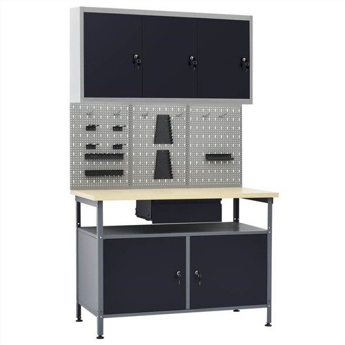 This set is combined with 1 workbench, 3 wall panels and 1 wall cabinet, which will make a practical storage solution to your workshop and garage. The heavy-duty workbench, standing out with ample storage space and 300 kg loading capacity. This workbench has an open compartment equipped with a drawer, to organize your tools, parts and accessories such as screws, nails and adhesive tape properly. There are 2 shelves and a large compartment with 2 lockable doors, which can easily accommodate drills, cable drums and grinders. Additionally, the feet are height-adjustable. This workstation is crafted from premium steel and chipboard, making it extra sturdy, durable and easy to clean. It is easy to assemble. These tool panels crafted from solid steel can bear the weight of various tools, like drills, pliers, screwdrivers and wrenches. The panels are perforated for fixing tools easily and securely. The 3 wall panels can be fixed together for extra rigidity. It is an ideal addition to your workbench and workshop cabinets with a practical width of 120 cm. The tool storage unit features three height-adjustable shelves and a perforated plate with holes that can be used to hang various kinds of tools such as spanners, pliers, hammers, etc. Equipped with three lockable doors (2 keys included for each door), this tool cabinet provides extra safety. It is made of metal with an extra strong scratch-proof coating, making it durable and easy to clean. This product needs to be assembled.