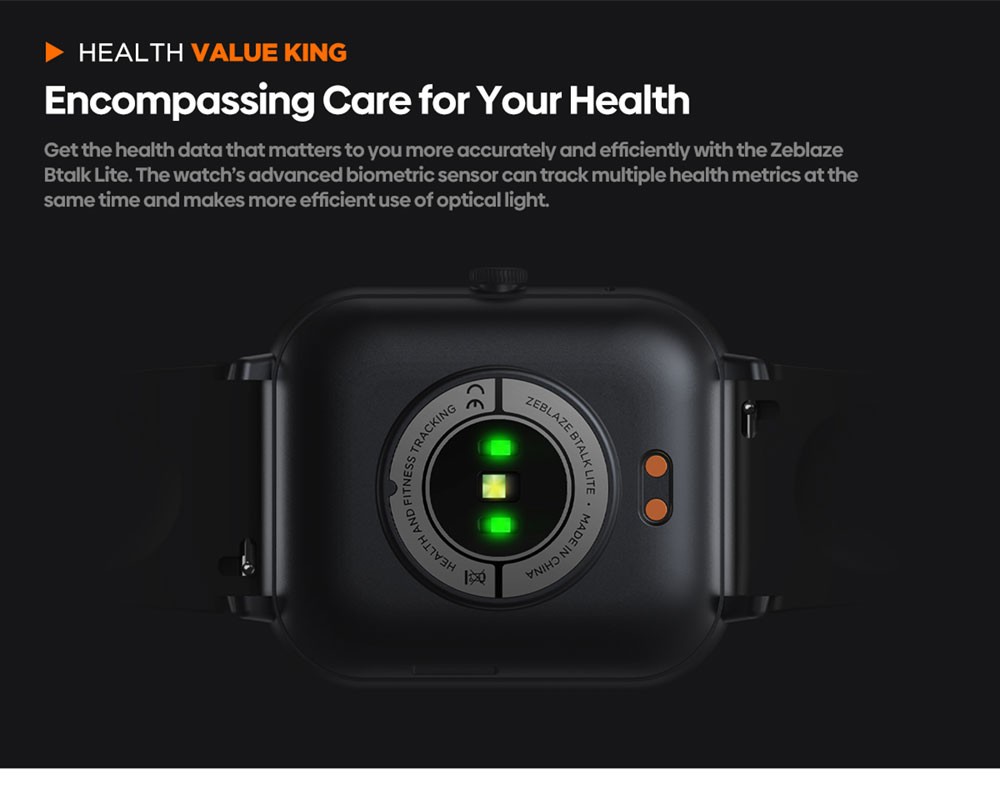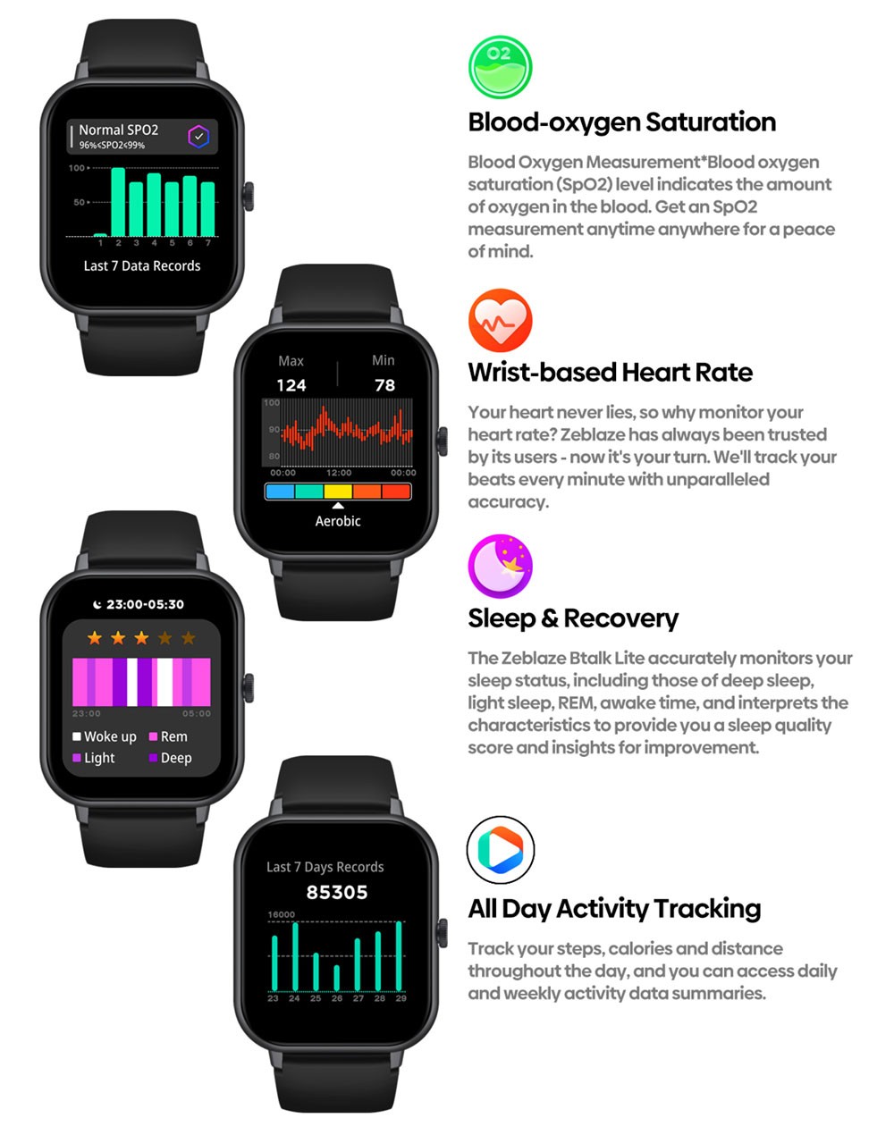 Functions Health Tracker: Wrist-based Heart Rate (Constant, Every Minute), Daily Resting Heart Rate, Abnormal Heart Rate Alerts, SpO2(Blood Oxygen) Level Measurement, Blood Pressure, Relaxation, Cycle Tracking, Sleep Score and Insights, Calorie Burn Tracking