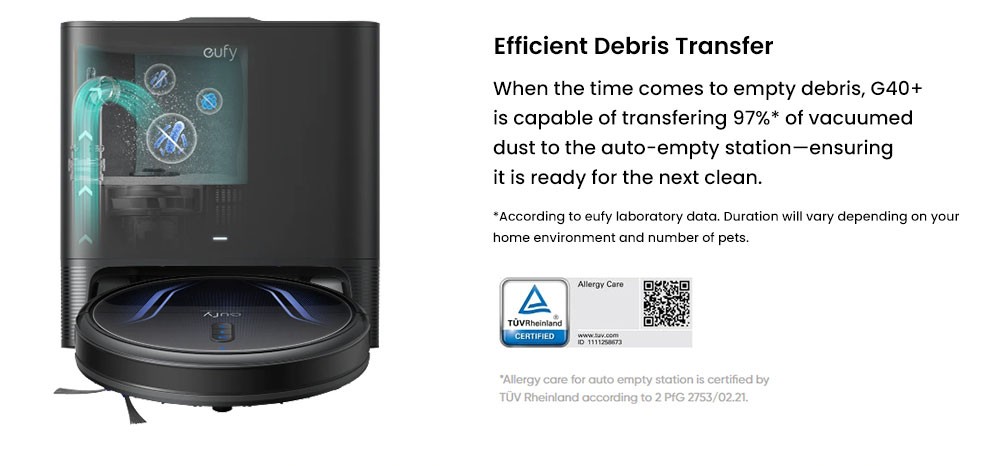 When the time comes to empty debris, G40+ is capable of transferring 97% of vacuumed dust to the auto-empty station—ensuring it is ready for the next clean.