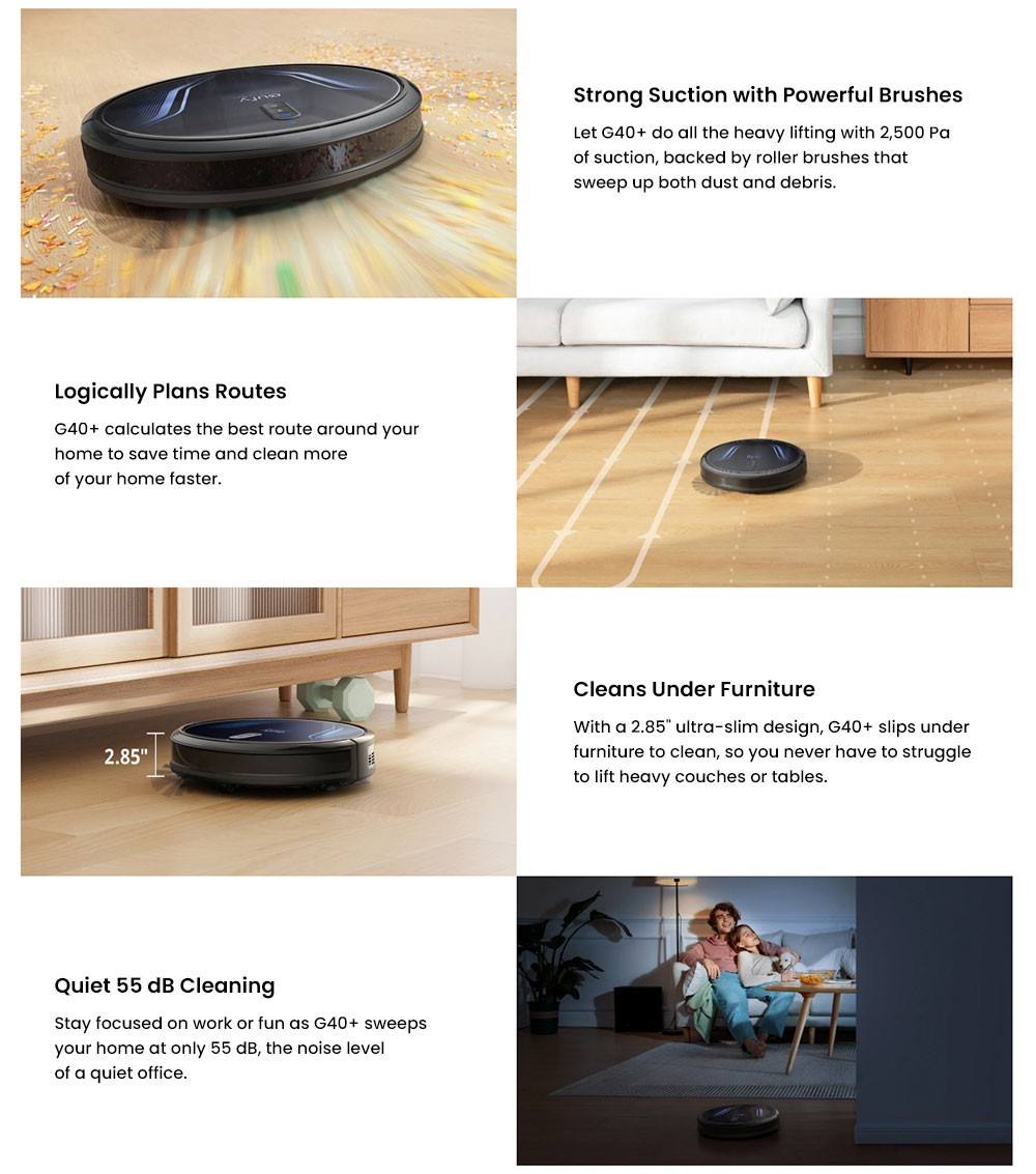 With a 2.85" ultra-slim design, the G40+ robot vacuum cleaner slips under furniture to clean, so you never have to struggle to lift heavy couches or tables.