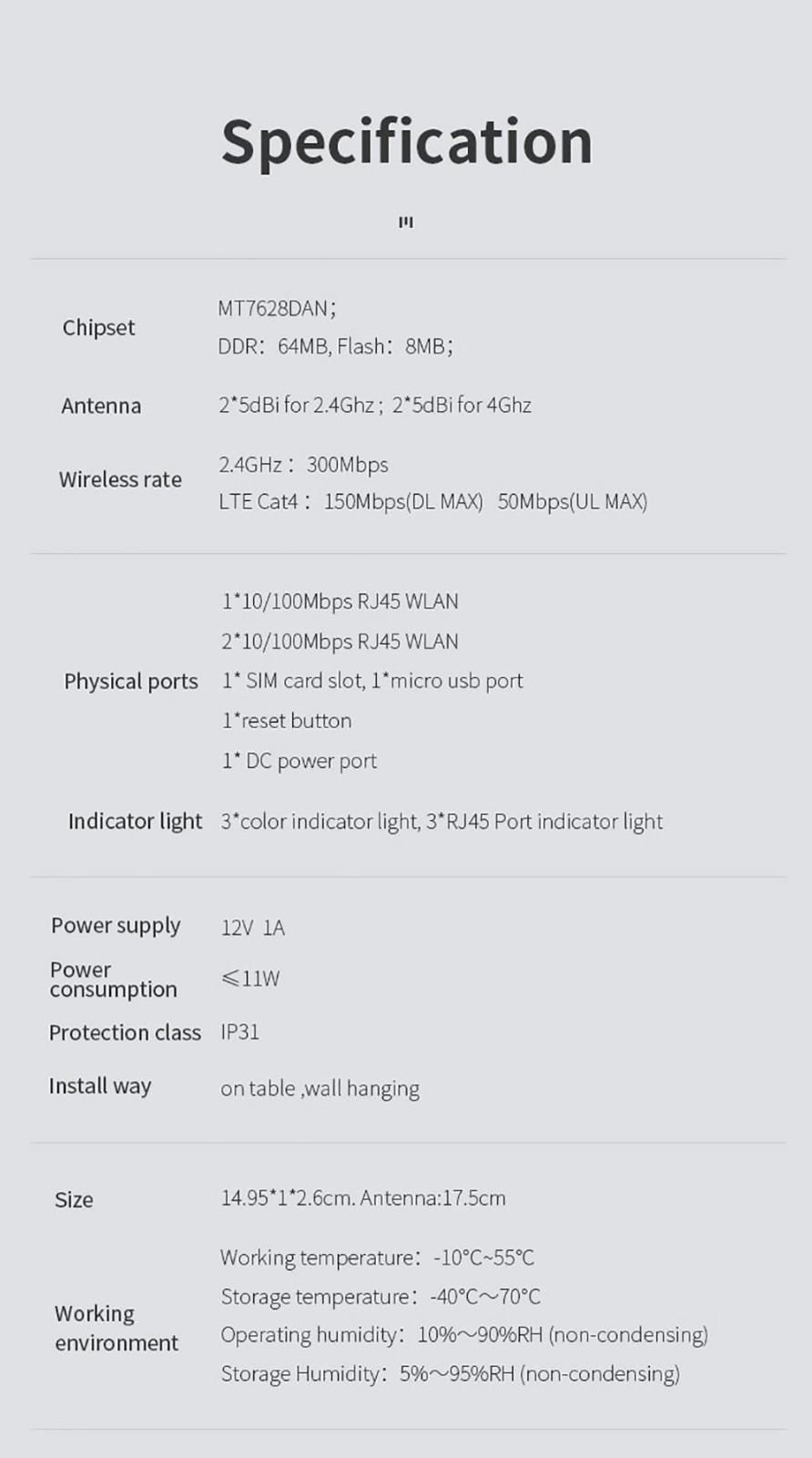 | Specification | Operating Frequency Band: 2.4G Main Control Chip: QCA9531 Wireless Rate: 300Mbps Flash/DDR: 8MB/64MB LTE Module: FIBOCOM L716 Network Interface: 3*10/100Mbps RJ45 Antenna Specification: 4*5dBi Omnidirectional antenna Power Supply: DC 12V 1A/Micro USB: 5V/2A |