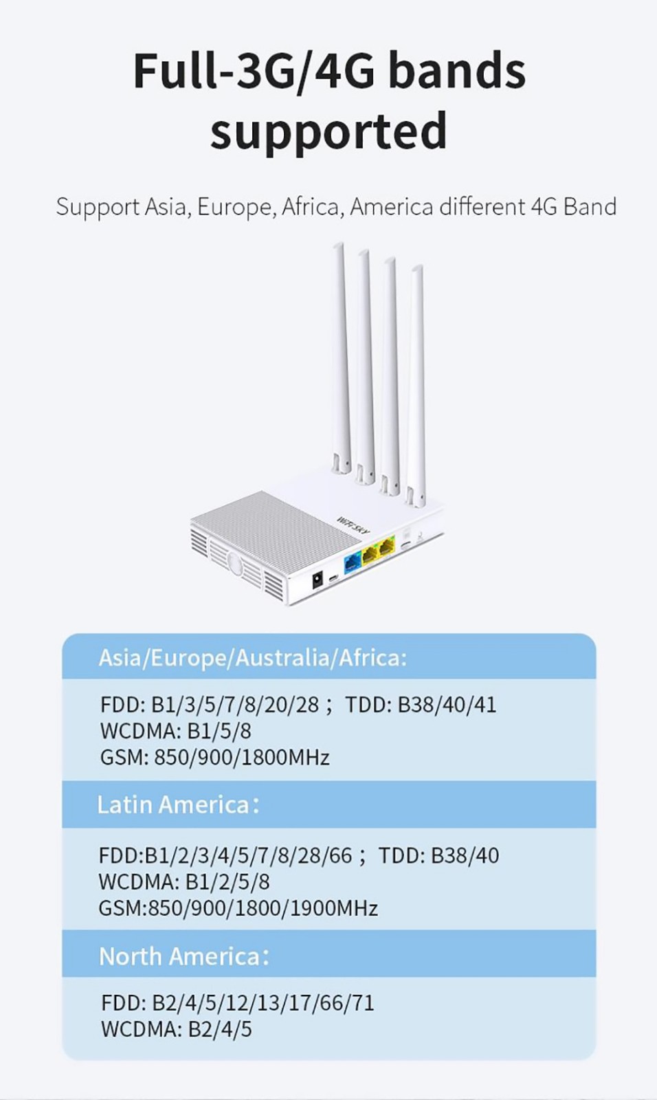 | Package Contents | 1 x Power Supply 1 x Network Cable 1 x 4G Router 1 x User Manual |
